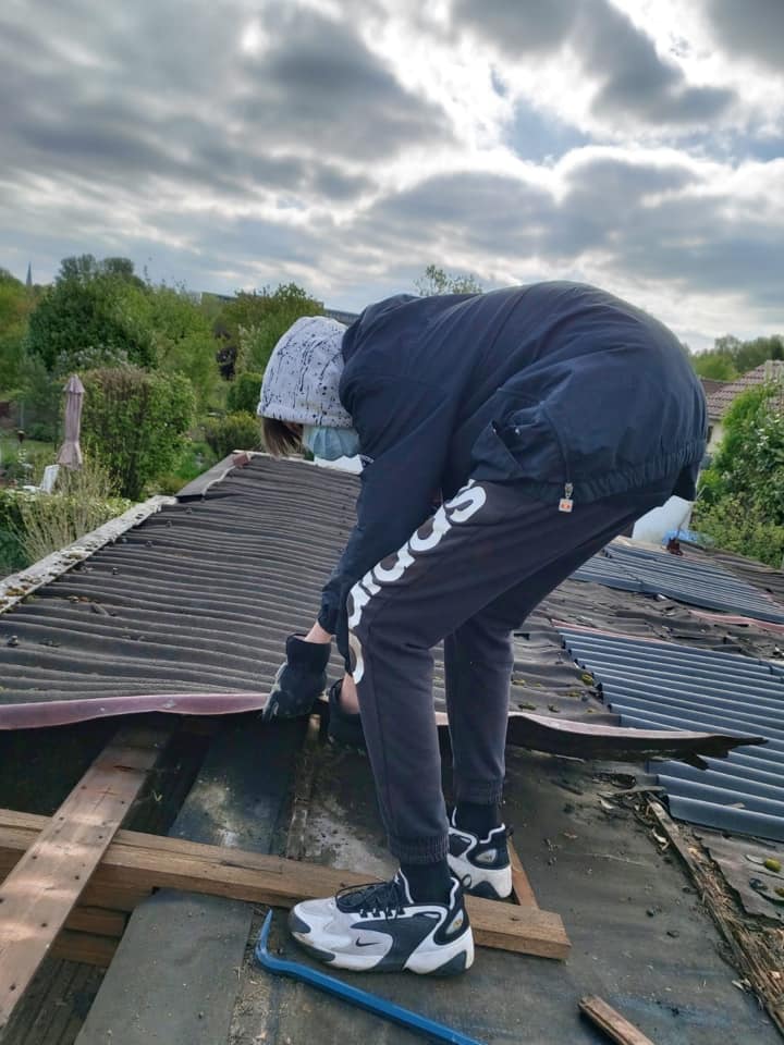 So wurde die ersten Tage Kernsaniert. Selbst unser Sohn packte fleißig mit an und hatte viel Spass beim Abriss des Daches und des Bodens in der Laube.